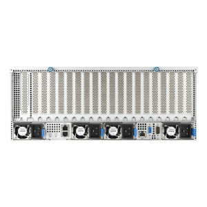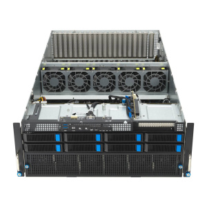 Двухпроцессорный сервер с графическим процессором высотой 4U на базе процессоров Intel Xeon Scalable 4-го поколения, который поддерживает восемь двухслотовых графических процессоров, решение для коммутатора PCIe 5.0, решение для жидкостного охлаждения, 32 модуля DIMM, 13 модулей PCIe 5.0, восемь модулей NVMe, четыре блока питания Titanium мощностью 3000 Вт, OCP 3.0, и ASUS ASMB11-iKVM.